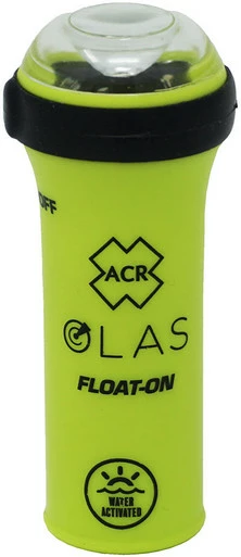 The ACR Float-On is a buoyant water activated strobe and LED flashlight. The strobe automatically activates in water when its integrated water sensors detect six seconds of water connection. The separated and sunken water connection terminals ensure the device only automatically activates when fully submerged in water. The high-power LED strobe, visible up to 3 nautical miles away, flashes once every second for up to 20 hours and acts as an exceptional safety aid for both novice and experienced boaters.