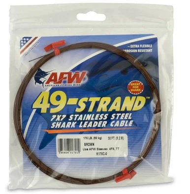 Made from high strength, corrosion resistant Type 304 stainless steel, 49-Strand 7×7 cable provides excellent protection against Shark and other big game toothy fish. This cable provides excellent kink resistance and bite protection. Often times when a shark strikes a bait, they twirl violently. This motion can kink single strand leader wire and can actually be more destructive to your tackle than a fierce bite. 49-Strand resists kinking, wrestles back and allows you to hook up and haul in.