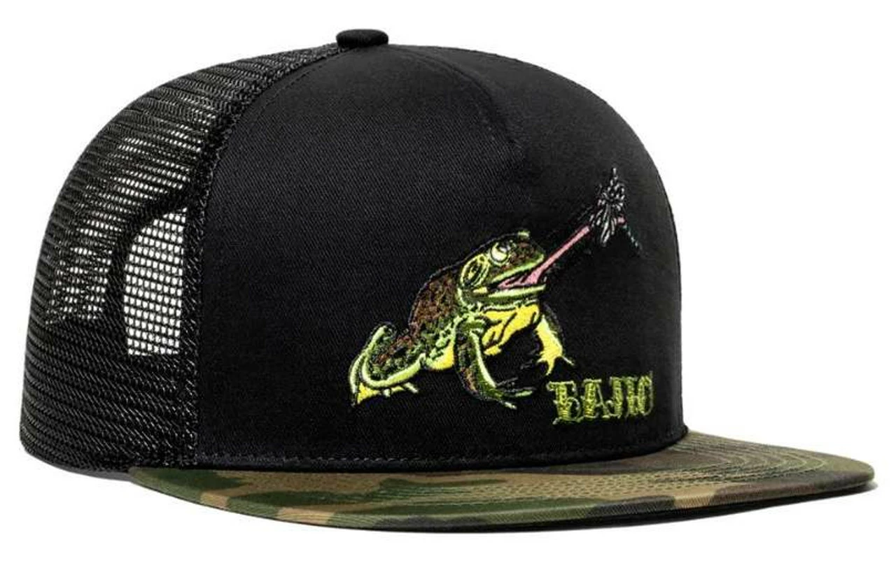 The Bajio Frog Trucker Hat is a 5-panel twill hat with a mesh back and embroidered Frog graphic. The flat brim includes green camo on top with a black twill underbill to decrease glare. Has an adjustable fit provided by the snap back for all head sizes.