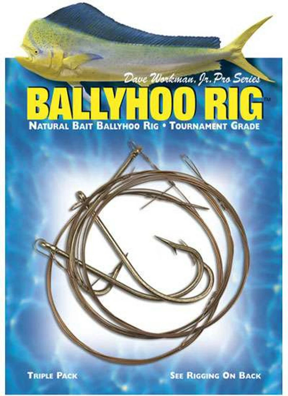 Boone Ballyhoo Rigs, Dave Workman Jr. Pro Series, are tournament grade and ready to fish. Uncoil and insert the hook through the gill area and out the belly. Be sure to break the back of the bait and place a small cut along the hook area to allow the bait to swim in a natural position. Insert the pin through the bill and mouth area and wrap with soft copper wire or a small rubber bond.