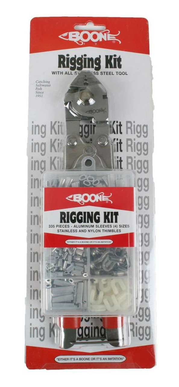 Boone’s Tool and Rigging Kit includes an all stainless steel Deluxe Heavy Duty 10 1/4″ Crimping Tool with non-slip custom grips and a variety of sleeves, stainless steel thimbles and nylon thimbles.