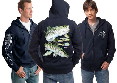 The David Dunleavy Striped Bass Hoodie is a heavyweight hoodie with a full front zipper. It’s a heavyweight hoodie made with 10oz fleece. It’s printed with dye sublimation artwork. It features David Dunleavy striped bass artwork design across the back, down the sleeves, and a small front chest David Dunleavy logo graphic.
