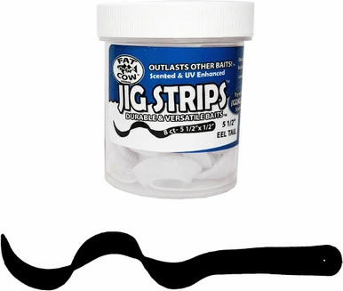 The Fat Cow Fishing Jig Strips Eel Tails are more durable and versatile than soft bait grubs, worms, and other alternatives. They offer bright coloring for strike simulating action and are scented with squid oil. The design of these strips helps to decrease the sink rate of your lure as well to keep you in the strike zone longer. These scented strips are perfect for surfcasting bucktails, jigging, trolling tubes, fluke rigs, umbrella rigs, and more.