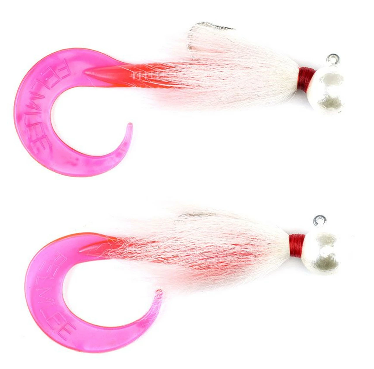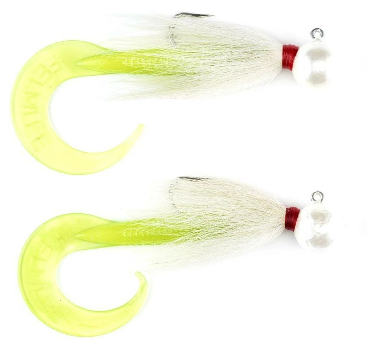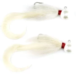 The Felmlee Sea Bass Curltails are made with Felmlee’s sea bass bucktail jig combined with Felmlee’s Curley’s curltails. These jigs are great for fishing from the shore or boat and are great imitators. Enticing predators with the strong imitation of prey. The ribbon style tail of the curltails flutters and waves for more natural movement. The 4oz size is ideal for swordfish and tarpon species. The 2oz size is ideal for Cobia and Striped Marlin species.