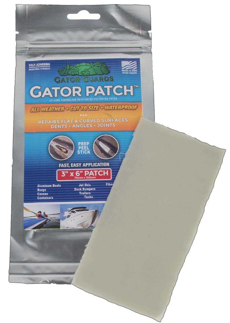 The Gator Guards Gator Patch is a fiberglass reinforced repair patch perfect for emergency repairs to kayaks, canoes, small fiberglass or aluminum boats, livewells, and many more other applications. Gator Patch is applied with a simple ?prep-peel-stick? process and cures under UV light in under an hour. When properly applied the finished product can be drilled, tapped, sanded, or painted.