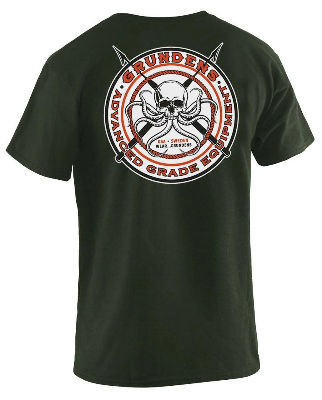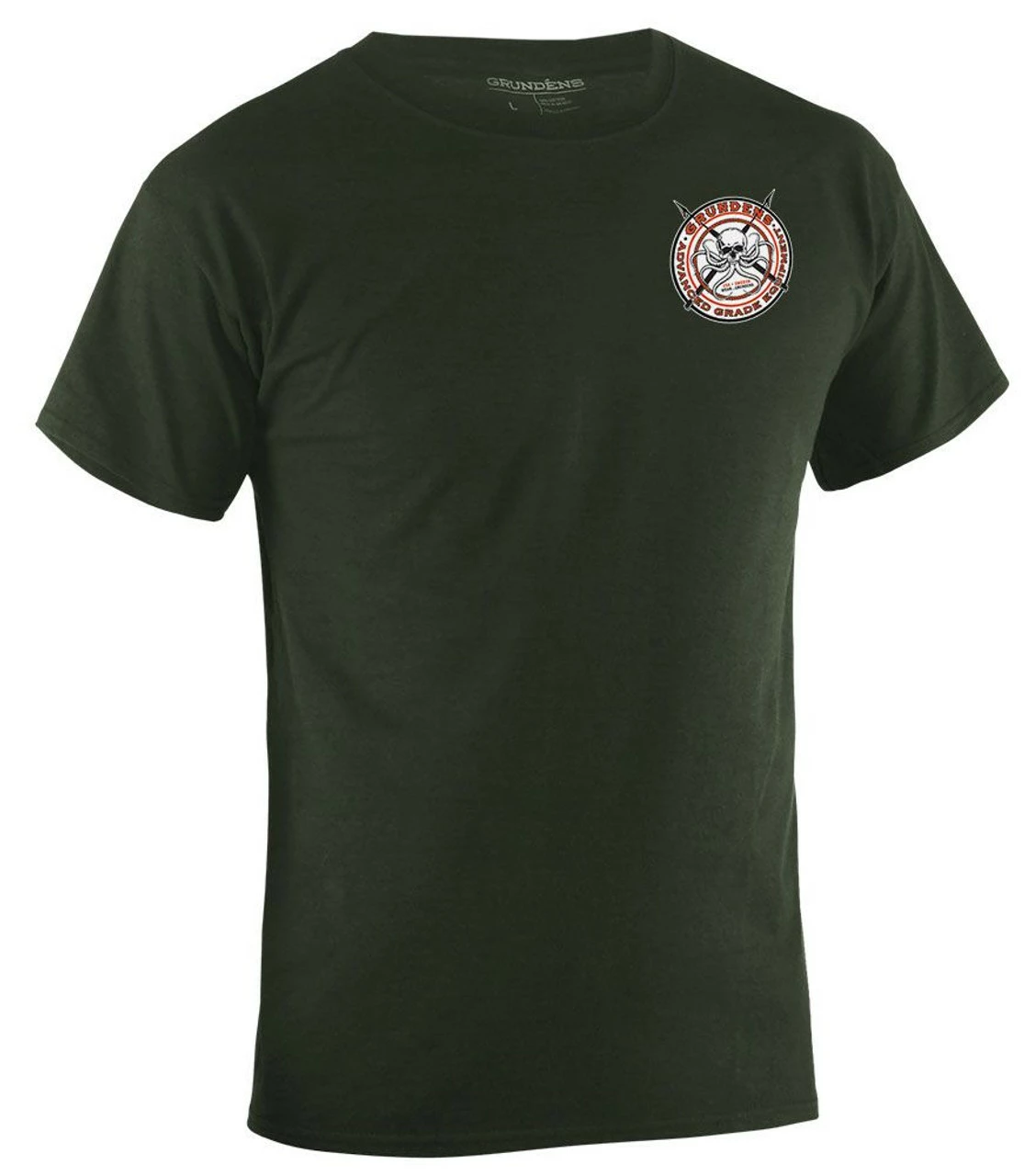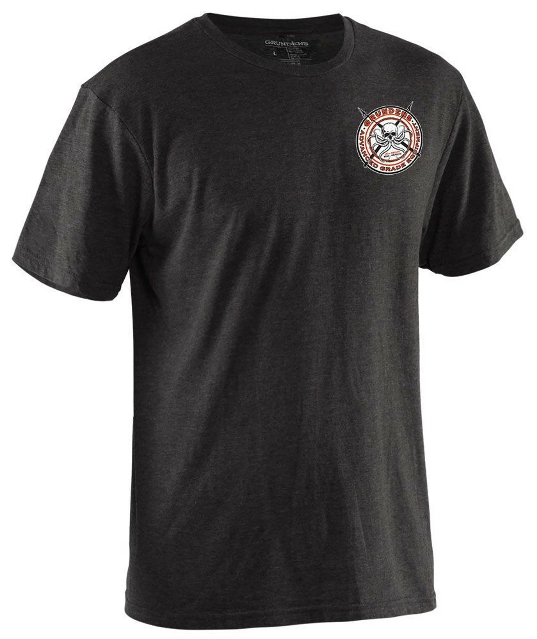The Grundens Davy Jones Short Sleeve T-Shirt is made with a comfortable modern fit. It features a Grundens skull printed design across the back and a small version across the front.