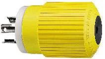 The Hubbell 305CRC Locking Connector Body 30A 125V has a yellow nylon body, nickel-plated contacts, and triple grip nylon cord clamp.