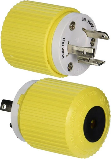 The Hubbell 328DCP Locking Plug is 28VDC, 30 amp, and sports an easily visible yellow color.