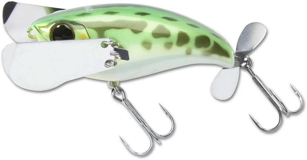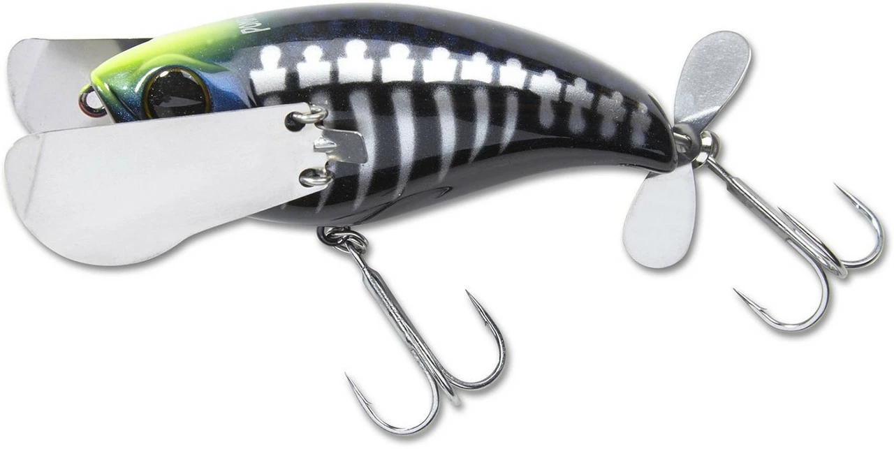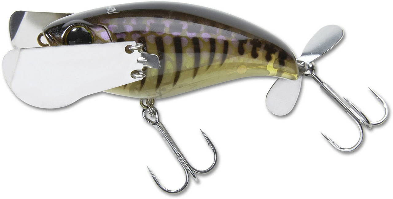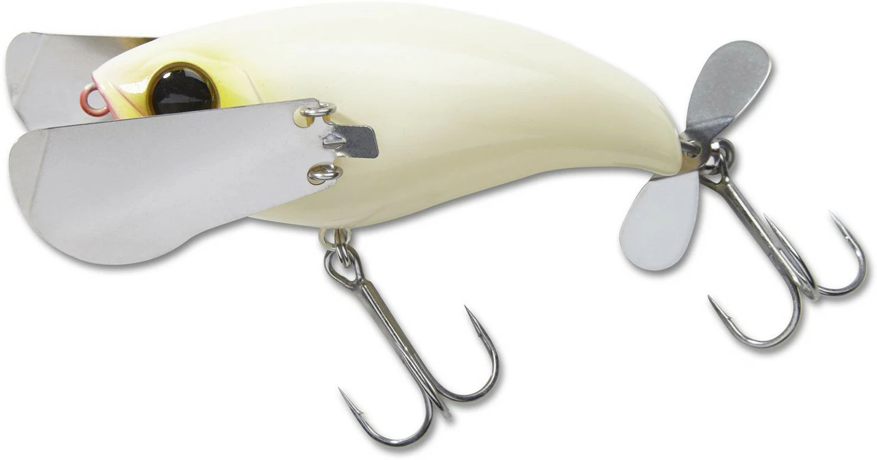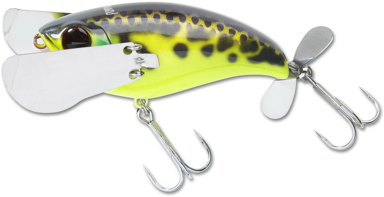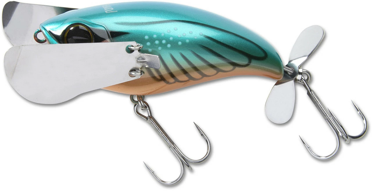 The Jackall Pompadour has gained a reputation of being one of the most unique and deadly topwater baits available. It’s not a buzzbait, it’s not a popper, it’s not a walking bait, it’s just simply the Pompadour and it belongs in your tackle box. The Pompadour produces a one of a kind “crawling” action with an un-matched body roll with the use of its metal wings fixed on the lateral sides of the bait. This thing literally does the freestyle stroke across the surface! Also implemented is a small propeller on the tail and an internal rattle to create the ultimate ruckus. The Pompadour aims to effectively imitate small birds, large insects, or amphibians traversing the top of the water column. Regardless of what the target fish thinks its eating, one thing is clear, this bait gets bit! Unlike walking baits or poppers, achieving the proper action is super easy. Simply retrieve the Pompadour on a slow to medium speed retrieve and allow the bait to do the work. The Pompadour is easy to work and a joy to cast, as the metal wings collapse forward on the cast giving the lure an aerodynamic profile.