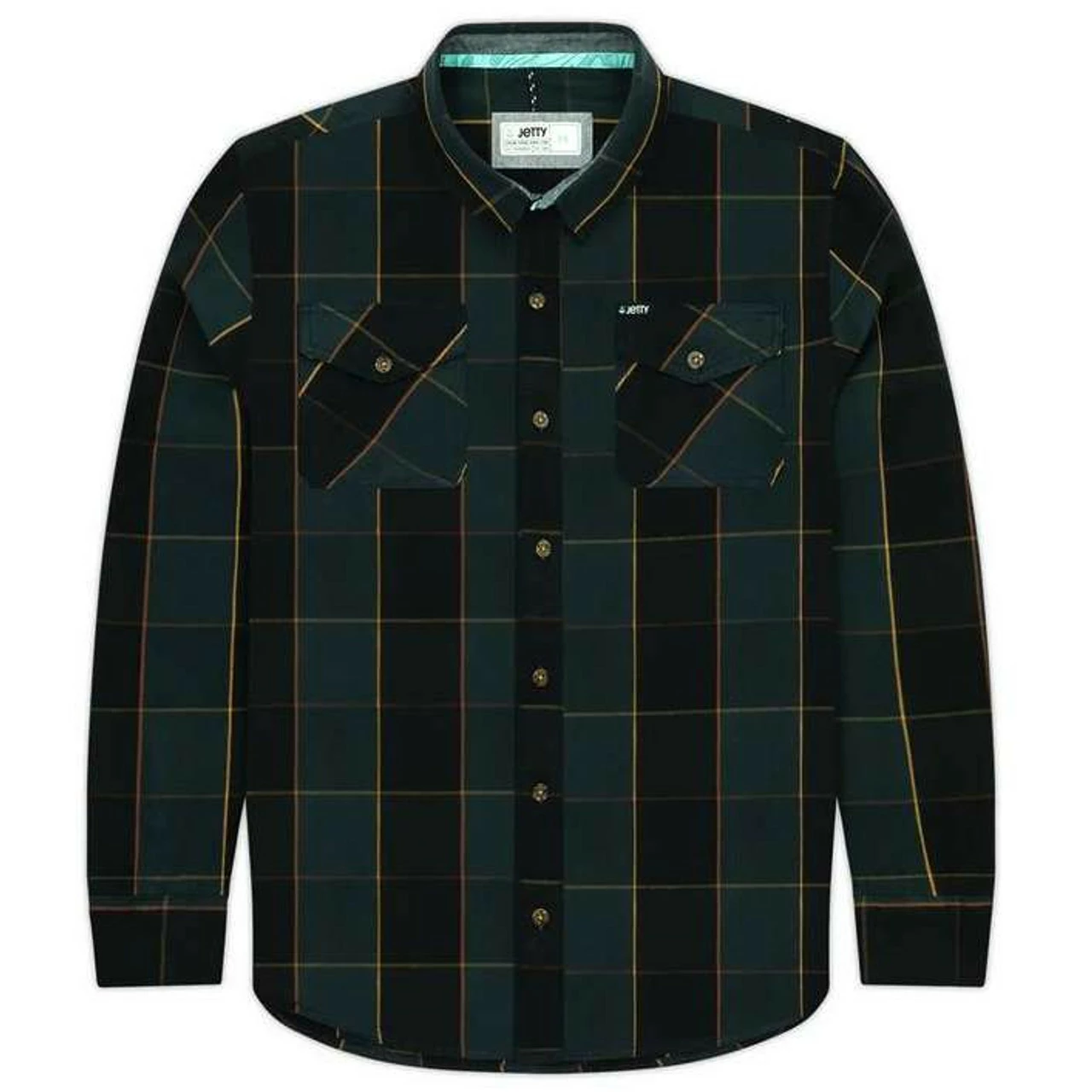 Featuring a sustainable construction from recycled materials, the Jetty Breaker Flannel is the warm, stylish, and responsible choice for all your chilly weather pursuits. This long-sleeve is ideal for anything from fall striper fishing to a night out for drinks. The Breaker features laser engraved buttons, large double chest pockets with Otis Pillar flaps, scallop side-seams with contrast fabric detail, custom labeling at neck, inner-placket, and chest pocket. Designed in New Jersey at Jetty HQ. 50% BCI Cotton / 50% Recycled Cotton (185 GSM) Construction.