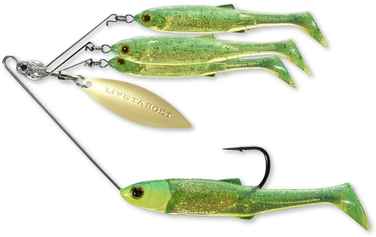 The LIVETARGET BaitBall Spinner Rig is certainly one of the most eye catching baits you’ll ever see. Designed to mimic a fleeing group of small baitfish, the BaitBall Spinner Rig is essentially the ingenious combination of a spinnerbait and an Alabama rig. At its core, the BaitBall Spinner Rig is built around a wire frame similar to those seen on traditional spinnerbaits. At the top of the frame are three soft plastic paddle-tail teaser baits, and at the business end is a larger “target bait” rigged on a razor sharp wide gap hook. All 4 realistically patterned swimbaits are strategically placed in a way that causes only the target bait to be eaten. Thrown into the mix is a single willow leaf blade for additional vibration and flash to attract hungry predators. The end result is a versatile lure that can be fished in an extremely wide variety of environments and situations. It’s perfect for those times of year when the baitfish are schooled together or for throwing into places that a full size A-rig can’t get into. All of the teaser and target baits are interchangeable with LIVETARGET’s BaitBall Spinner Rig Interchange Packs.