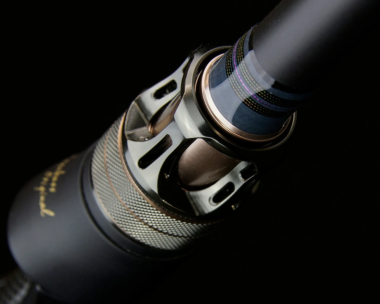 Weight-saving improvements in blank construction, thread wrapping method, reel seat and head locker design result in a lighter rod, which allows for lighter counterweights to achieve the ideal “Takumi” balance for each application. Even the F6-69X, which is balanced for a tip-up posture for heavy-cover applications utilizes a mere 8g counterweight contained in the End Balancer’s machined metal form. To reflect this achievement, the shining gold end cap emblem of previous generations has been updated to an understated “Bronze Meteo” finish.