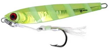 The OTI Degen Jig is the perfect combination of a slow pitch jig and vertical jig. The rigid keel on the front side will reduce the speed of the fall and produce an even consistent flutter action, while the backside has a reverse contour that will provide a large darting action when speed jigging. The three vibrant color with glow stripes are sure to attract anything in the water column or on the bottom. Comes rigged with a Raptor Glow Assist Hook, Split Ring and HD Solid Ring.