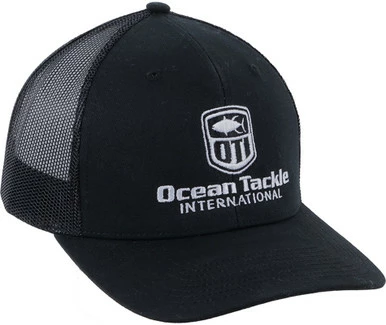 The Ocean Tackle International Logo Trucker Hat is a trucker style hat featuring an embroidered OTI logo across the front and mesh back.