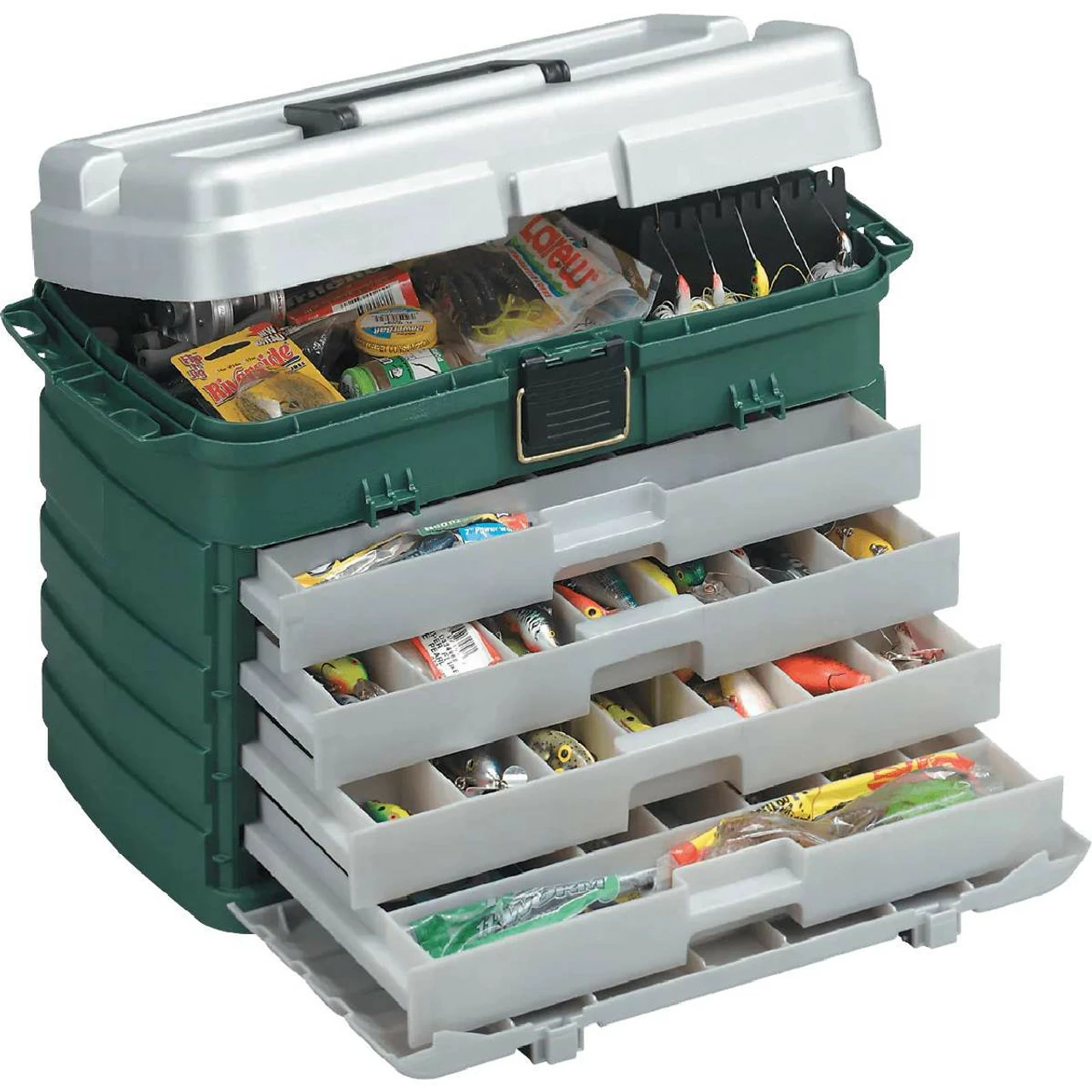 The Plano 758 tackle box is uses 4 drawers that incorporate 4 bait racks for storing lots of tackle. The 100% wormproof, impact-resistant plastic construction also includes side bait racks for storing extra tools and other small items.