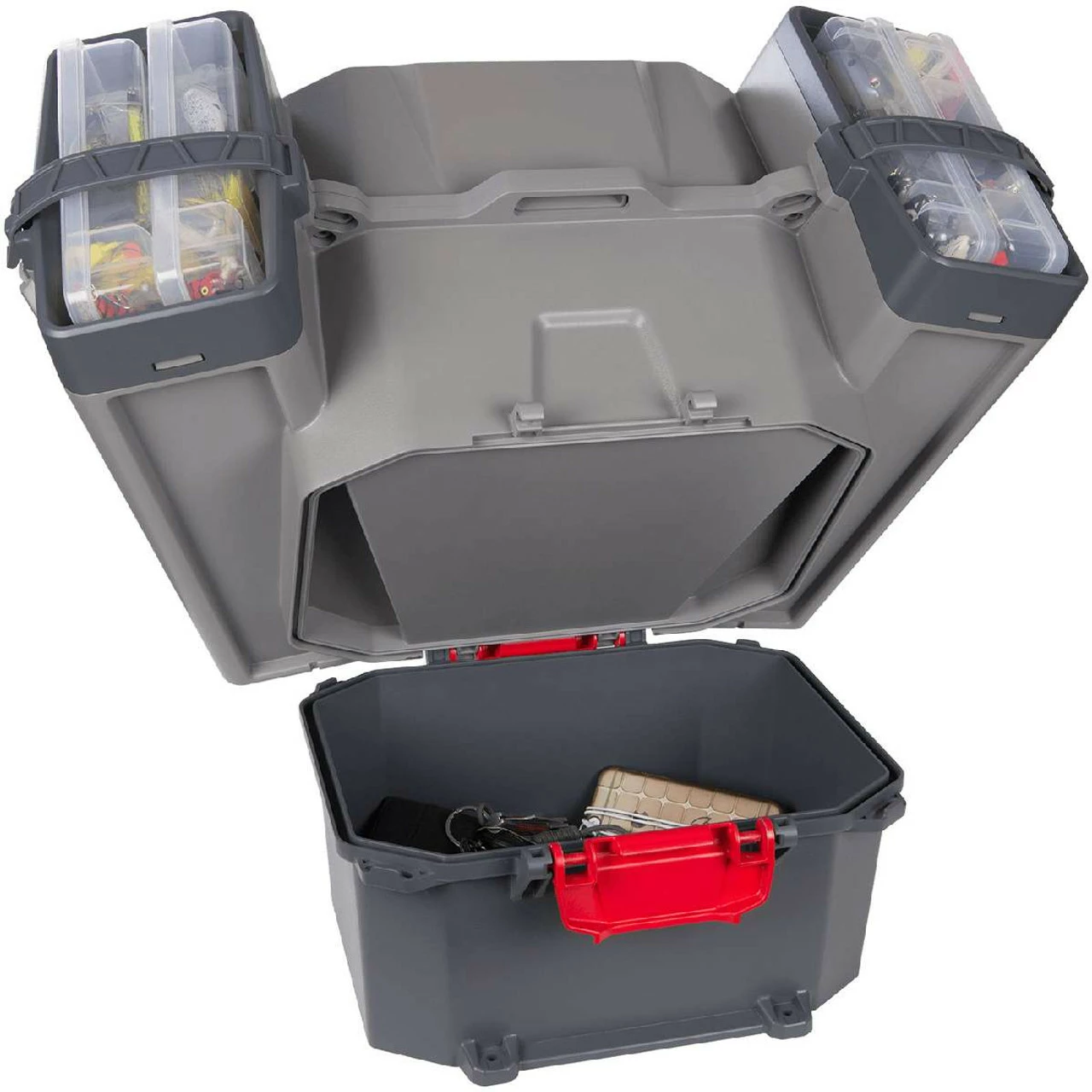 The Plano Kayak Series V-Crate is the ultimate tackle storage system for kayaks. The V-Crate improves upon the popular milk crate model by offering convenient storage in a V-shaped profile that wraps the kayaker with easily accessible storage on either side. Each side features an open slot that holds two 3600 or 3700 size Stowaway Utility Boxes. The Boxes are securely held with a rubber strap at an angled orientation. Each outer wall features a rail system where rod holders and other accessory clips can be attached. Directly behind the kayaker is the main storage compartment that has enough capacity to store larger items such as drift anchors, rain gear, food and drink, etc. Beneath the main storage compartment is a smaller, completely waterproof section where valuables such as phones and wallets can be safely stored without having to worry about water intrusion. The main section has unprecedented amounts of storage space, yet remains compact enough to fit in the vast majority of kayak models.