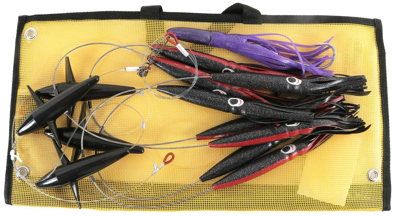 Expertly assembled for maximum surface action, the PlayAction Splash Dancer Chains are the perfect addition to any offshore trolling spread. These chains consist of 4 separate Splash Dancer Rigs that consist of a 5in Humming Bird that connects two 9in bulb squids via a steel wire. That gives you 4 birds and 8 squid to simulate a delicious looking school of bait, and a 9in Machine Stinger rigged with an 8/0 heavy duty southern tuna hook to seal the deal. All connection points are professionally crimped with chafe gear for maximum reliability. These chains are great for catching tuna, wahoo, dolphin, billfish and more. The Splash Dancer Chains are especially effective when pulled from the long rigger or down the middle just behind the long rigger, but will also work well from anywhere else in the spread.