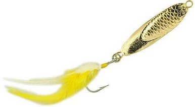 Point Jude Lures Gold Sea Scallop & Feather (2 oz) will get distance and lots of flash; it’s a great fish finder. The gold color, although not as well appreciated in the north as it is in the south, is a deadly color. It works well in low light… and remember that two of the most sought after baitfish in the water, herring and menhaden (aka pogies or bunker), have a gold flash to them when they turn in the water.