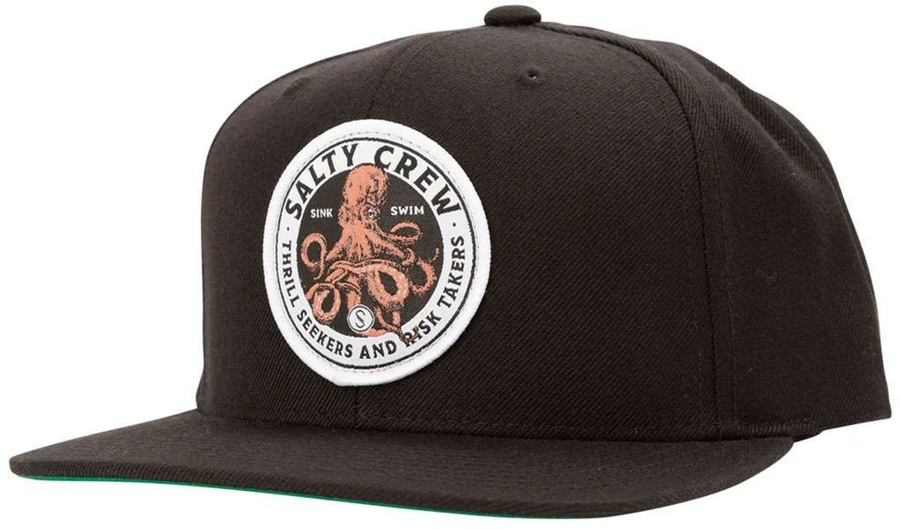 The Salty Crew Deep Reach 6 Panel Hat is a structured 6 panel snapback hat. It features a woven damask patch across the front and is made with 80% Acrylic/20% Wool material.
