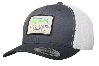 The Salty Crew Mahi Mount Retro Trucker Hat is a structured 6 panel retro style trucker hat. It features a woven damask patch across the front and is made with 47% cotton/25% polyester/28% nylon materials.