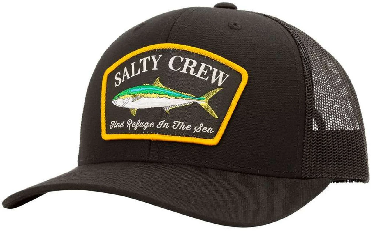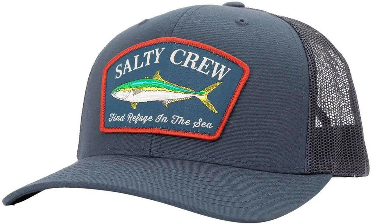 The Salty Crew Mossback Retro Trucker Hat is a structured 6 panel trucker hat. It features a woven damask patch across the front and is made with 47% cotton/25% polyester/28% nylon materials.