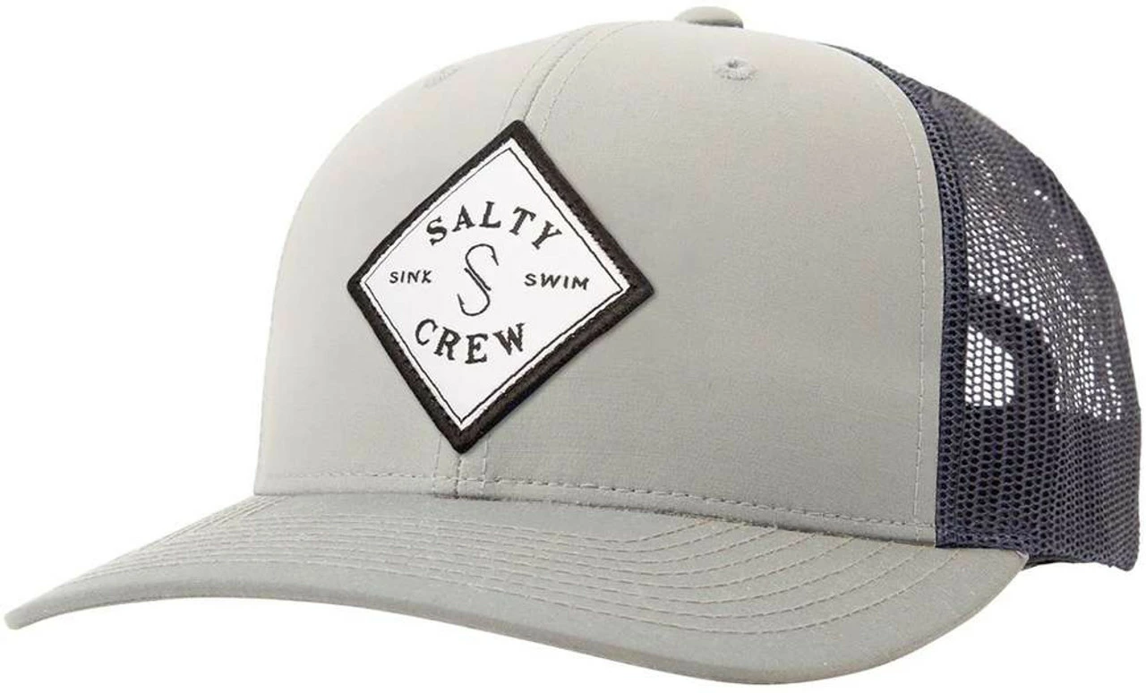 The Salty Crew Sea Line Retro Trucker is a structured 5 panel trucker hat with Salty Crew woven damask patch across the front.