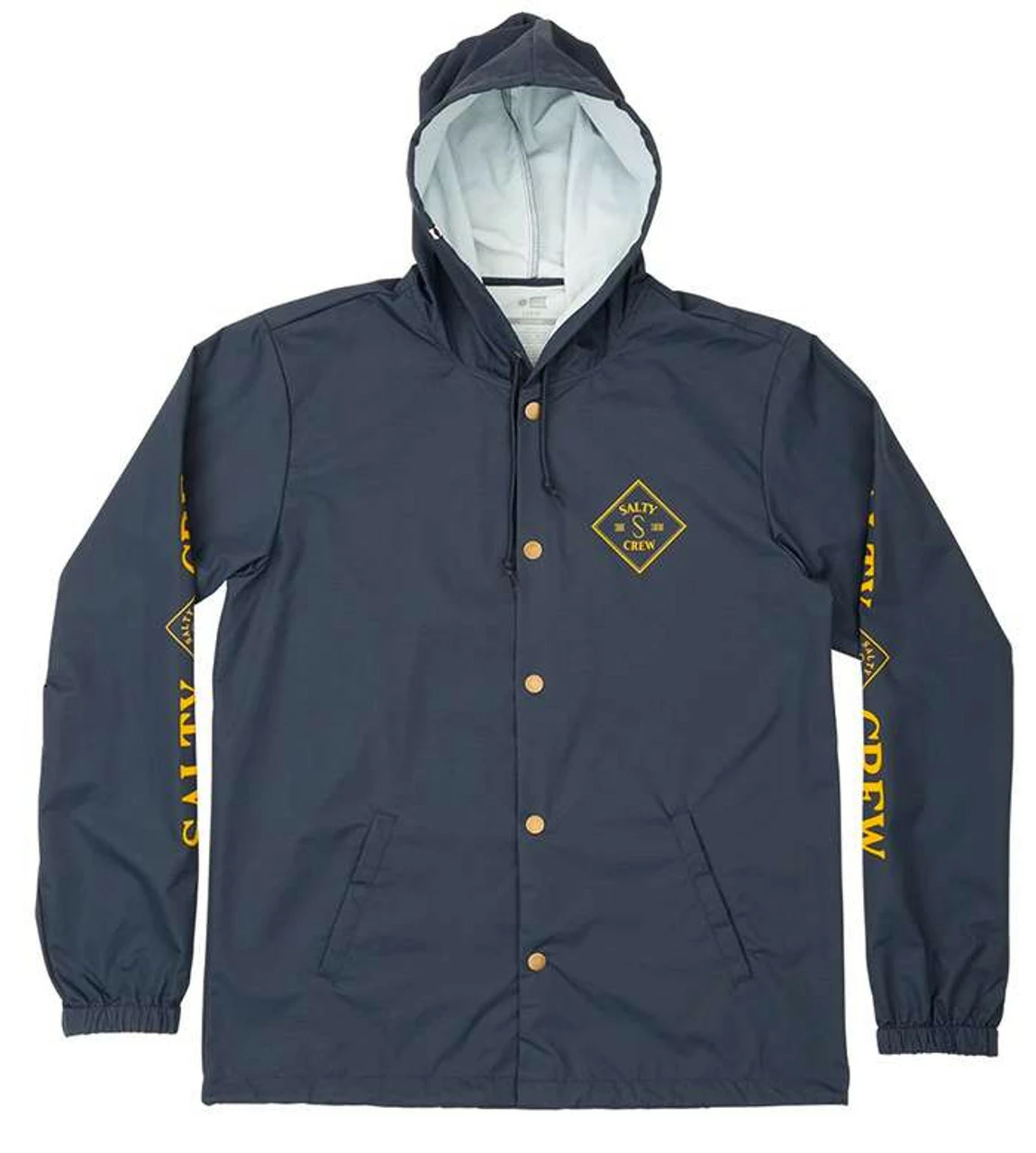 The Salty Crew Tippet Snap Jacket is made with 5K 100% nylon material. It’s a full snap up style jacket featuring Salty Crew logo design across the back with Salty Crew text design down both sleeves. The fabric of this jacket is 100% waterproof but the seams are not, making this jacket water resistant.