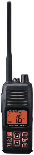 The submersible HX400 combines multiple features for a wide variety of users. Commercial tough construction with all VHF marine channels, optional speaker microphone jack, voice scrambler, noise cancelling microphone and 40 programmable LMR (Land Mobile Radio) channels with CTCSS and DCS signaling. The HX4000S is popular among recreational and commercial boaters. Additional features include Built in Voice Scrambler for private communications, Programmable Scan, Ch16 Priority Scan, Dual Watch, channel names, NOAA weather channels with weather alert, selectable 5/2.5/1 Watt transmit power, 8-channel preset key and a low battery life indicator. Supplied with a new ultra-high capacity Lithium Ion battery with 2550mAh Li-Ion battery, heavy duty belt clip, 110 VAC and 12 VDC trickle chargers with a drop in cradle. The HX400S is backed by an industry leading 3-year waterproof warranty.