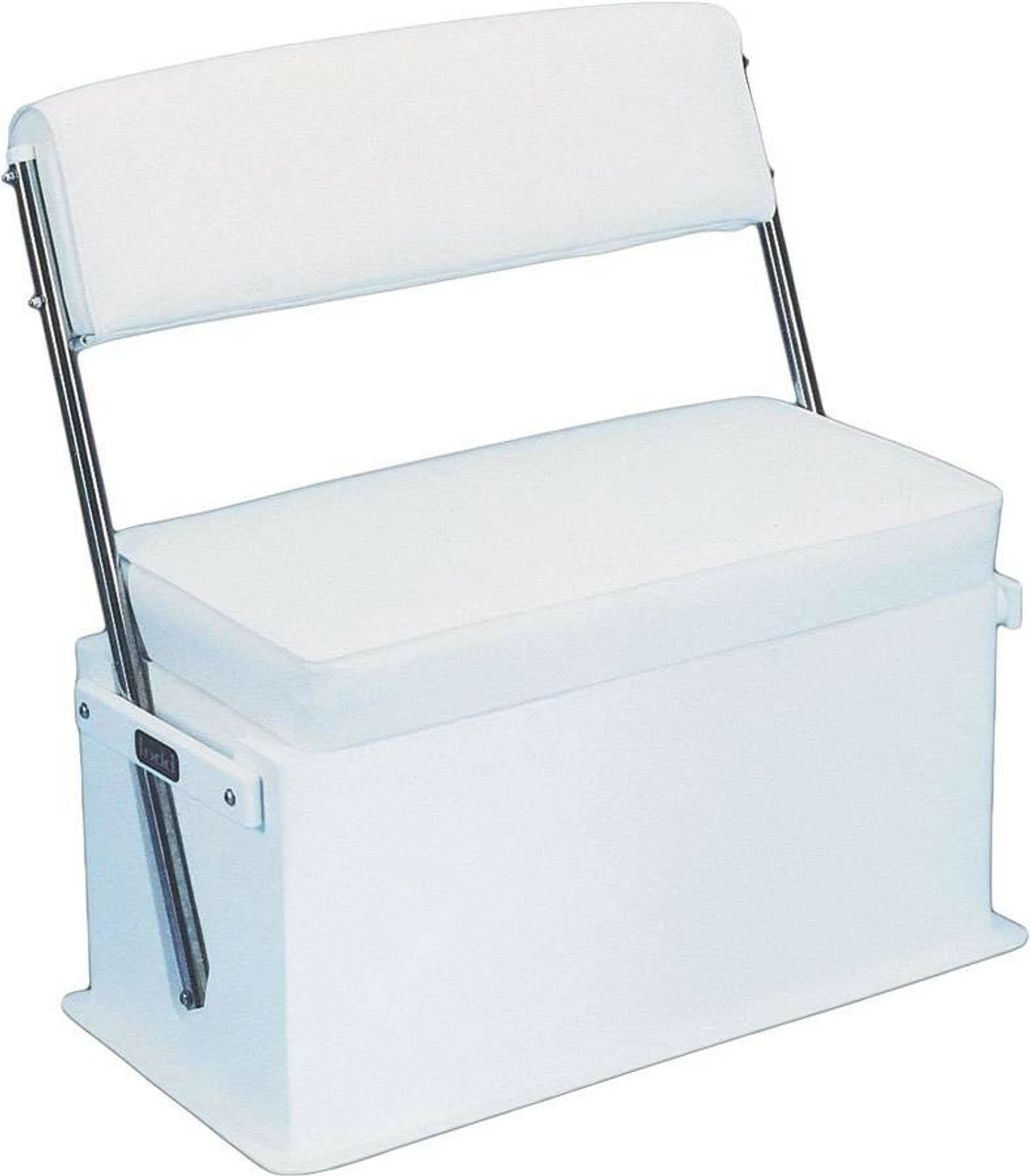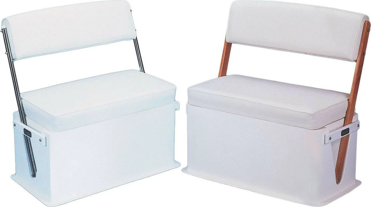 Todd Swingback Seats feature heavily padded white marine grade vinyl bottom and back cushions, mahogany or stainless steel swing-arms that fit into a recessed pocket, a double-wall foam insulated interior with rounded corners that prevent bait from becoming trapped, and a drain fitting. The wide flange around the bottom of the unit makes installation easy. Todd’s most popular swingback style seat!