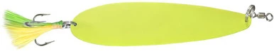 The Tony Maja Flutter Drift Spoons come in 5 colors. They are just under 5 ounces and come equipped with a 5x strong 5/0 Mustad Treble hook and 200# split rings on both sides with a 175# barrel swivel on top split ring. They are all electro painted and plated for the metal colors. These spoons get their name “drift spoons” because they are a little bit heavier and can be used more efficiently with a drift.