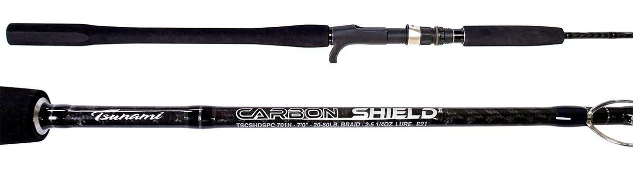 Well-built and an absolute blast to fish, the Tsunami Carbon Shield II Slow Pitch Jigging Rods are perfect for the angler who loves the feeling of a big fish on a light rod. These extra parabolic jigging rods are ideally suited for slow pitch jigging, but also function well when used for more standard jigging techniques and even live bait and bottom fishing. They truly are a do-it-all rod for anyone who likes a rod with a deep, satisfying bend. The blanks are made with a unique pure carbon fiber construction that utilizes multi-directional layering for outstanding strength despite a slim profile and highly flexible blank. Carbon Shield II Slow Pitch Series ditches the minimalist style handles commonly seen on other slow pitch rods for a more traditional and more comfortable full length EVA handle. Quality Fuji componentry is used throughout, including a graphite reel seat and Fuji K Frame Guides for exceptional durability and smooth line management. Anglers will find the Tsunami Carbon Shield II Slow Pitch series to be one of the most fun-to-fish rods in their arsenal thanks to the unique rod action that turns any size fish into a big fish fight.