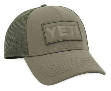 YETI classic trucker hat with olive on olive patch design. The all black exterior on this trucker hat is made of an Ottoman weave fabric and premium mesh, which provides a soft feel with comfortable mid-profile fit. This hat features a moisture wicking headband to keep your head comfortable even on the hottest days.