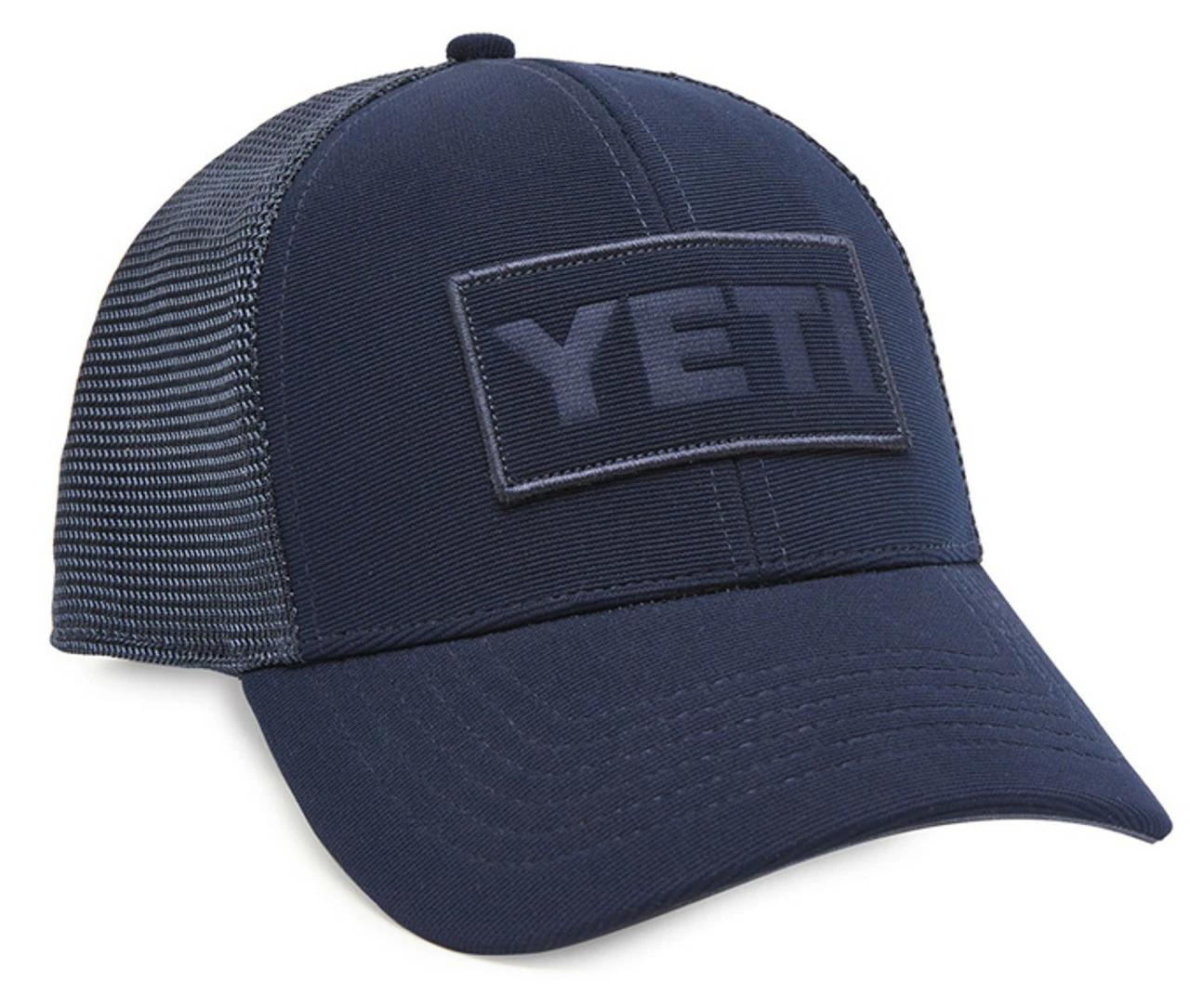 YETI classic trucker hat with navy on navy patch design. The all navy exterior on this trucker hat is made of an Ottoman weave fabric and premium mesh, which provides a soft feel with comfortable mid-profile fit. This hat features a moisture wicking headband to keep your head comfortable even on the hottest days.